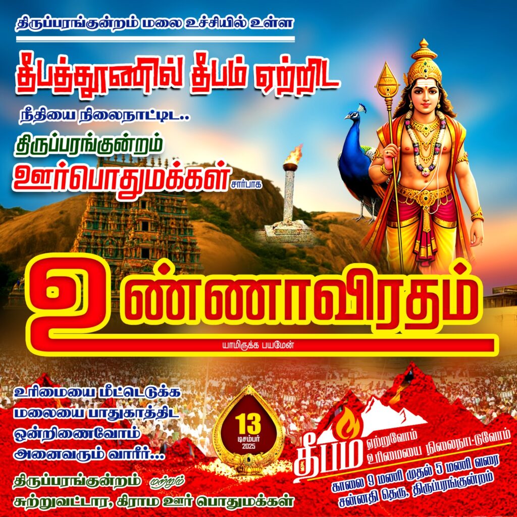 திருப்பரங்குன்றம் மலை உச்சியில் தீபம் ஏற்ற கோரி நாளை 13ஆம் தேதி உண்ணாவிரதம் போராட்டம் நடத்த நீதிமன்றம் சென்று நிபந்தனைகளுடன் உத்தரவு வழங்கப்பட்டுள்ளது.