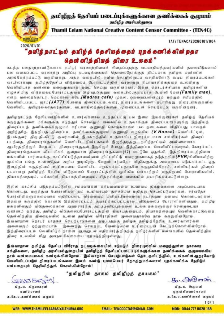 இவ்வாறான தமிழ்த் தேசிய விரோத நடவடிக்கையில் ஈடுபடும் திரையுலகில் மறைந்துள்ள நாசகார சக்திகளை, தமிழீழ அரசியல்துறையின் தமிழீழத் தேசியப்படைப்புக்களுக்கான தணிக்கைக் குழுமமாகிய நாம் வன்மையாகக் கண்டிக்கின்றோம். இவ்வாறான செயற்பாடுகள் தொடருமிடத்தில், உங்களின் ஆதரவோடு வெளியிடப்படும் திரைப்படங்களை இனம் கண்டு புலம்பெயர் தேசத்துமக்களால் புறக்கணிக்க நேரிடும் என்பதையும் தெரிவித்துக் கொள்கின்றோம் என அறிக்கை வெளியீட்டுள்ளது.